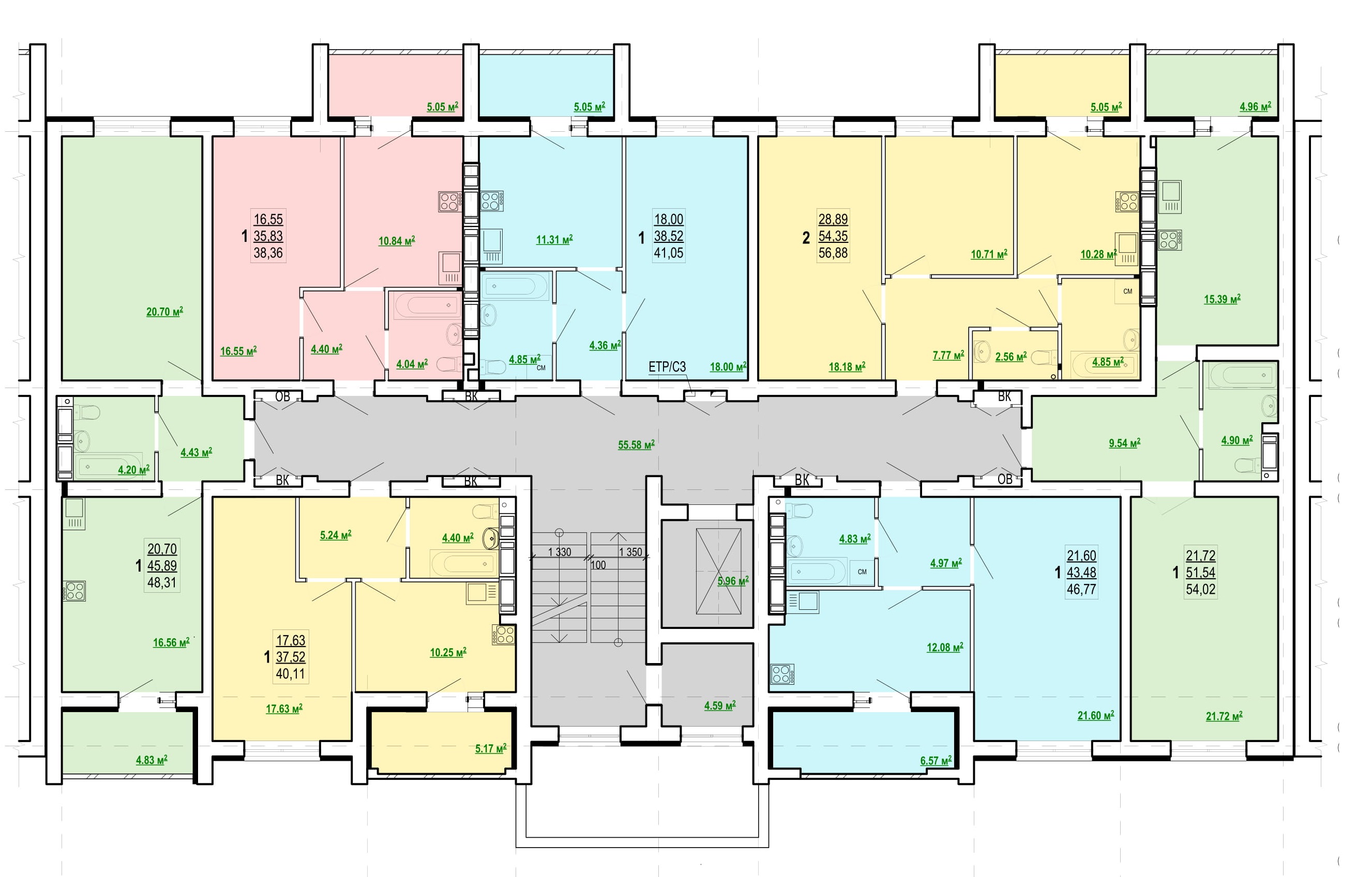 1к - 38,36 - 41,05м2; 46,77 - 21 000 грн/м2;